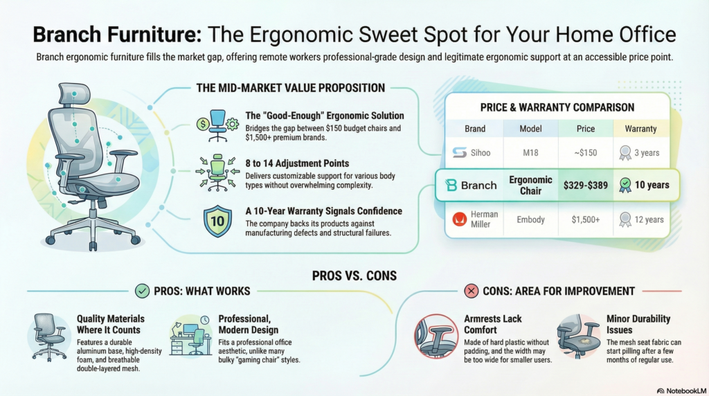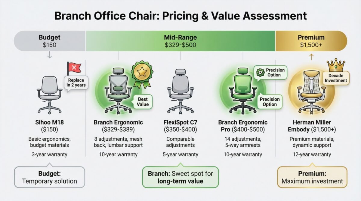 Branch positions between budget options you’ll replace within two years and premium investments you’ll keep for a decade. At $329 for the base Ergonomic model, the value proposition strengthens considerably.