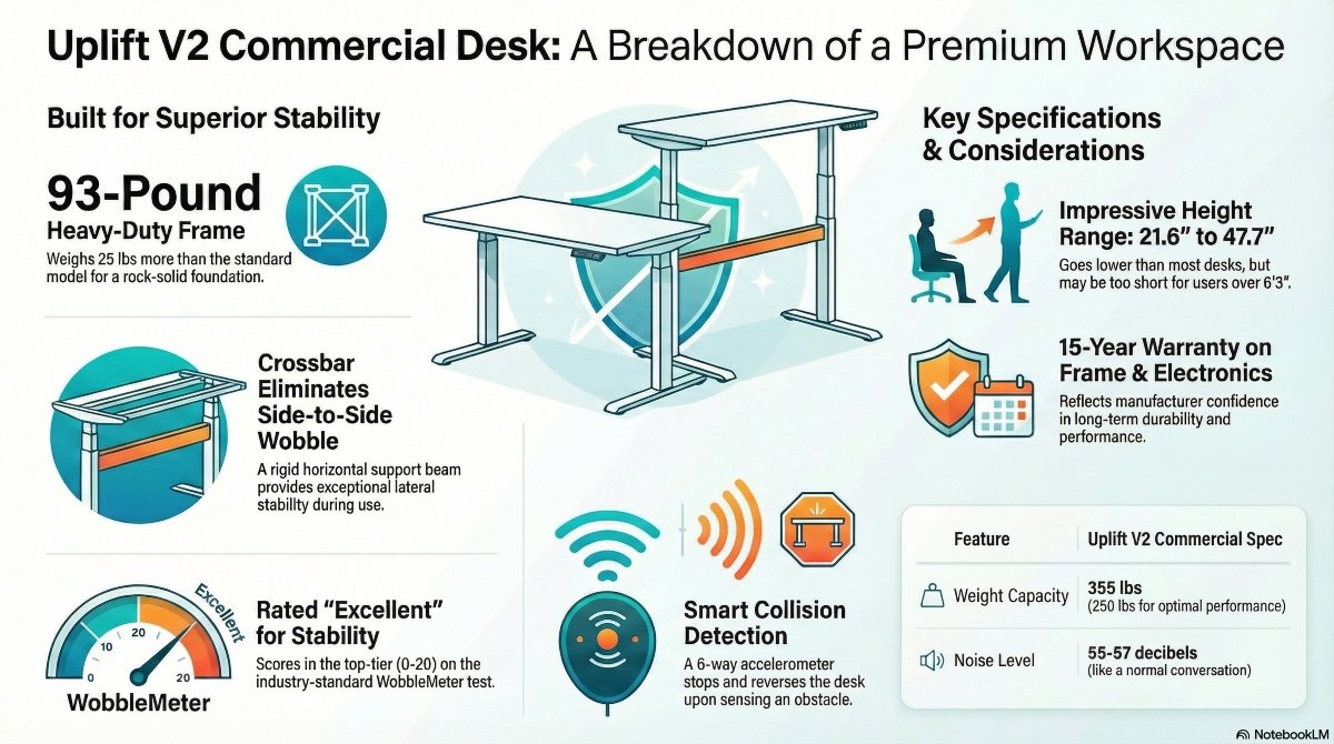 The term “commercial grade” gets thrown around a lot in furniture marketing, but with the Uplift V2 Commercial, the designation actually means something tangible. We’re talking about a frame that weighs 93 pounds compared to the standard V2’s 68 pounds.
